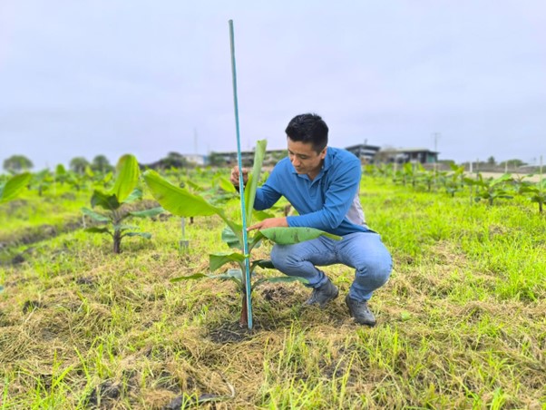Foto: investigadores de INIAP monitoreando enfermedades foliares en plantas de banano Formosana